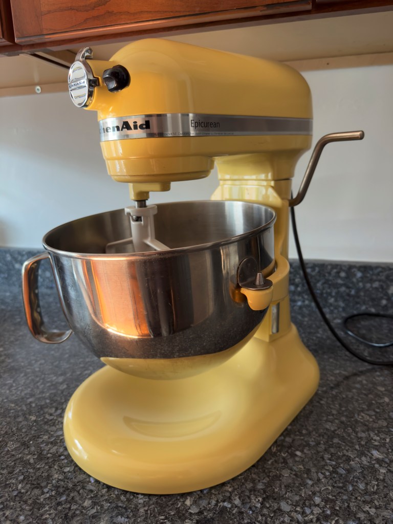 Rare vintage KitchenAid Epicurean stand mixer in a beautiful pale yellow. This model is known for its powerful motor and durability—built to last and perfect for serious home bakers or collectors.