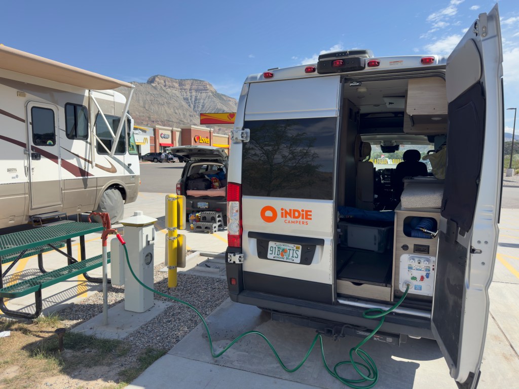 Now on day five, my water tank was running low and the gray water tank needed to be emptied. I pulled up the app and found that there was a Love’s Truck Stop just half a mile away. I parked in one of the regular parking spots (I love that the van fits in a regular parking spot) and walked to the back of the store where the trucker supplies were. The manager, Thomas, could not have been more helpful. He walked out and showed me how to empty the gray water and offered for me to use one of the vacant RV camping spots to fill my water tank.
