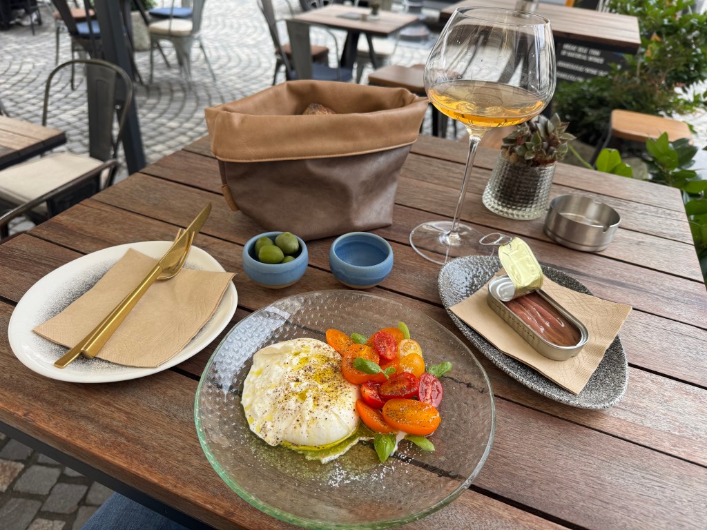 While I had little appetite and was too congested to taste anything, I did try the orange wine that I’d heard about. I’ve had blueberry wine, and cherry wine, why not orange wine? The server at the wine bar started talking about minutes of “skin contact” and managed to keep a straight face when I asked “You mean the skin of the orange?” As it turns out, orange wine is basically what you get when you use the process for making red wine, but use white grapes to do it. Despite the fact that I generally do not like white wine, it was actually quite delicious.