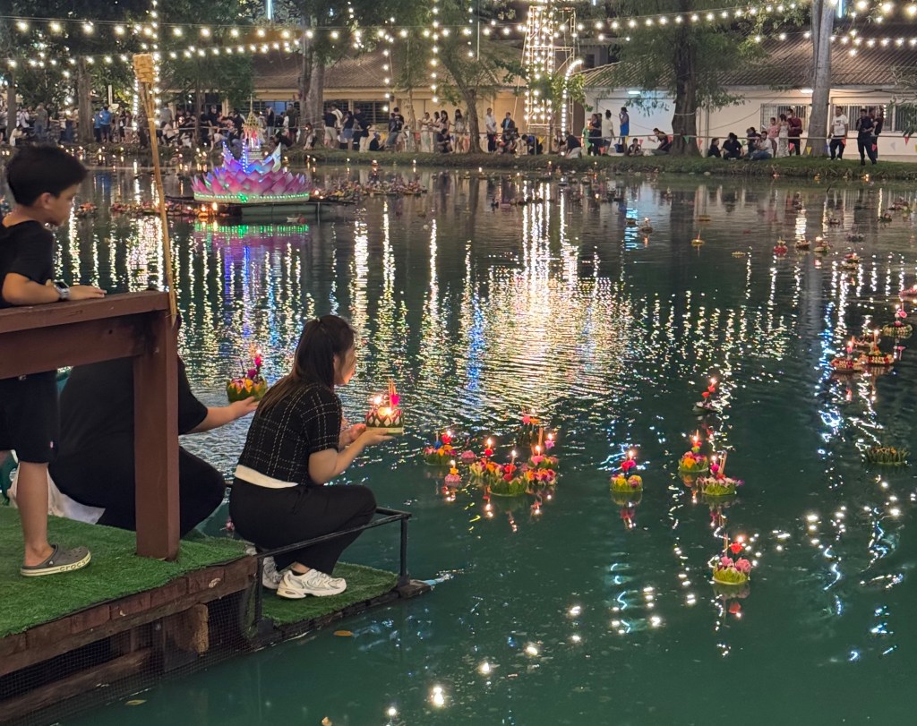 About two dozen of us walked to the nearest water and joined a line. At the front of the line there was a dock with a torch for lighting candles and incense. People of all ages waited patiently until it was their turn to place their floating lantern, say a few words (a prayer, an intention, letting go of negative emotions) and release their krathong. I chose to say “I release my anger, fear, and worry. May I have the courage to follow joy wherever it leads me.”