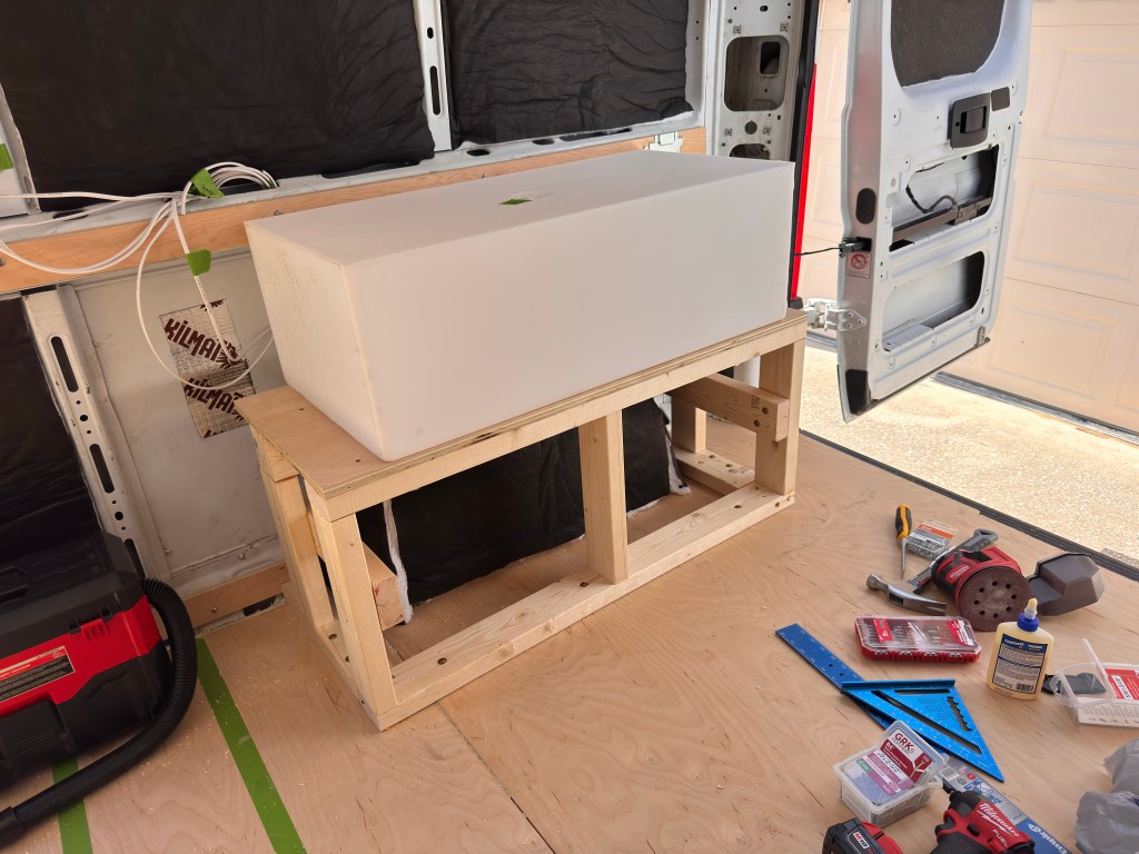 Inspired and armed with new ideas, I came back to the build for another week of learning new skills. I spent 7 hours one day building a sturdy wooden platform to support the fresh water tank in the “garage” space. I used the orbital sander, scribing compass, step bit, and deburring tool for the first time. And yesterday I spent 5 hours installing the gray water tank under the van. I did it by myself—but it doesn’t feel like I’m doing this alone anymore.