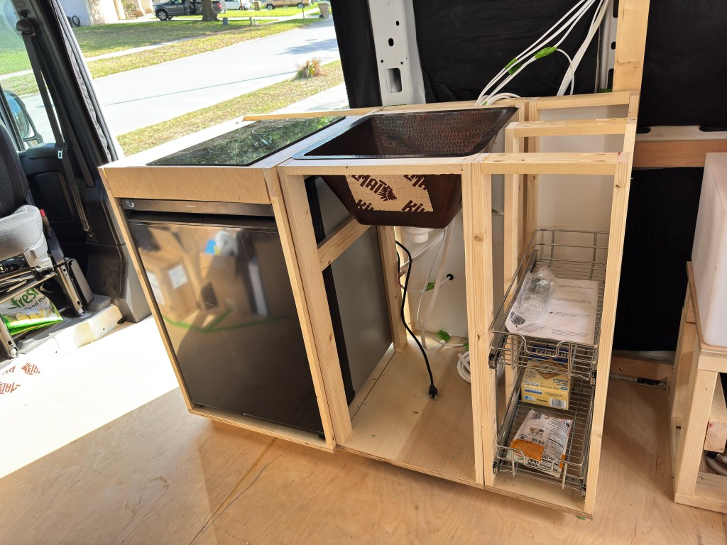 The great thing about this project is that it’s like every day is a new puzzle to solve, and some of the puzzles even build on each other. I love puzzles. New skills this week included wiring my first switch and using a heat gun to apply heat-shrink electrical connectors. I made my first “plunge cut” with the circular saw, where you lower it onto a piece of wood while it is running. This was great practice for when it comes time to cut a hole in the butcher block counter for the sink.